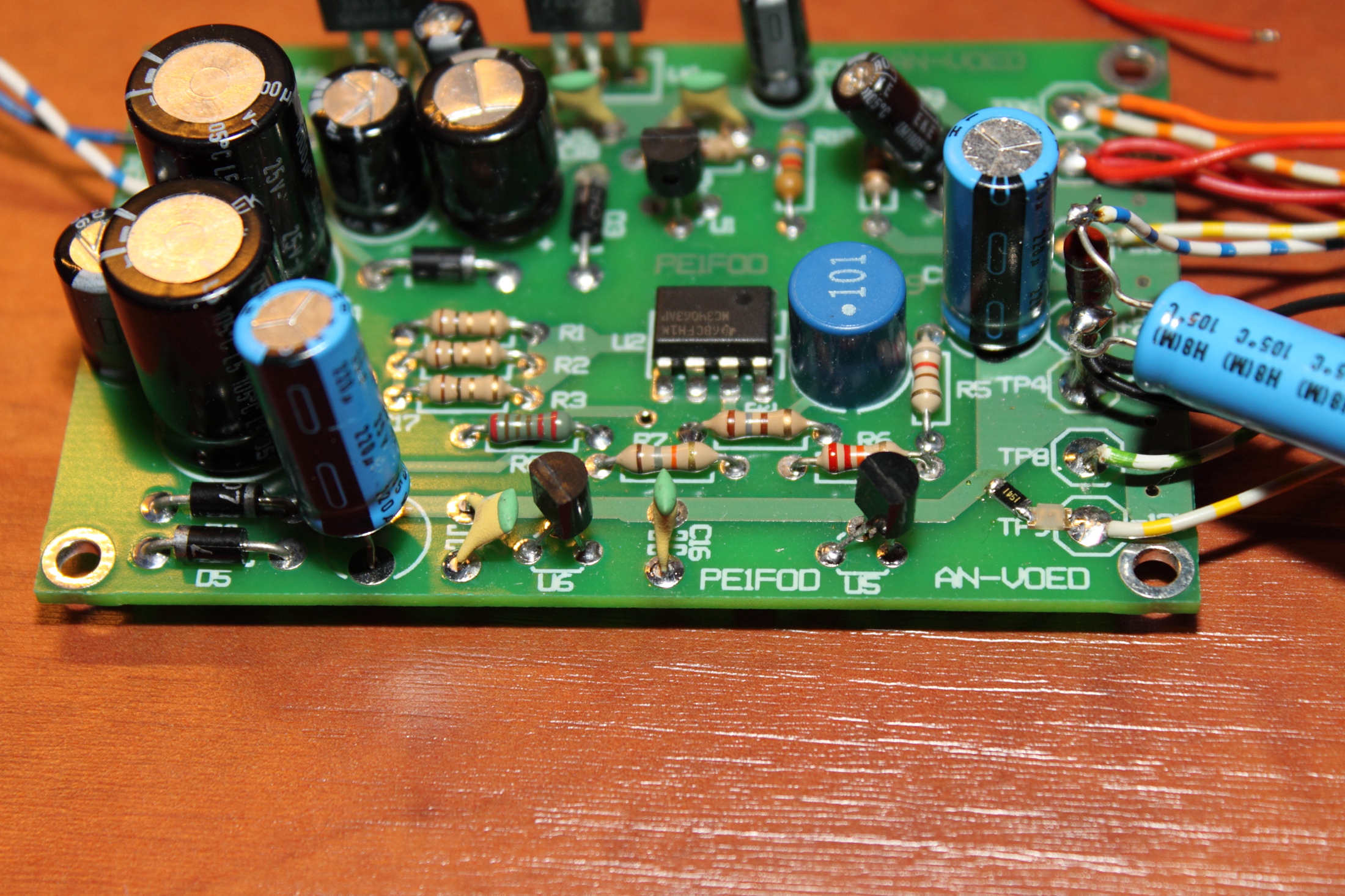 - De gelijkrichter onderop de print wordt redelijk warm. De dikke elko's aan de andere kant zou je om die reden iets zwevend boven de print kunnen plaatsen. Hij gaat er echt niet kapot van, maar voor de levensduur wellicht verstandig.