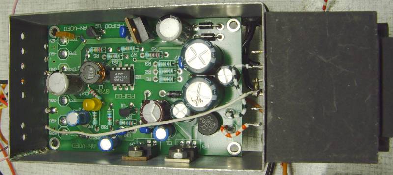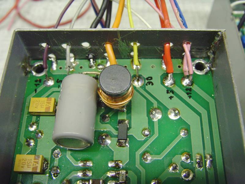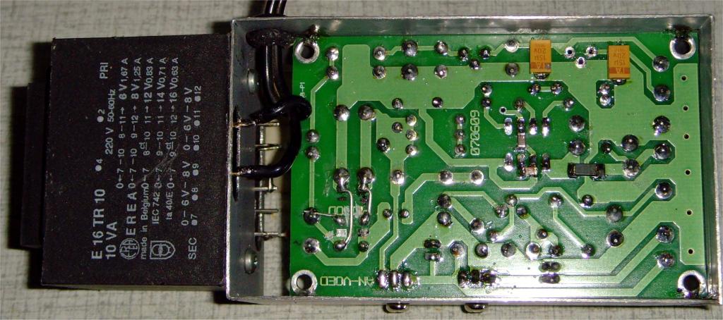 Update:Bij het samenbouwen bleek dat het helemaal niet zo makkelijk werkt als je de draden langs de bovenkant van de print wil solderen. Je kan er niet goed tussen en zit makkelijk met de soldeerbout tegen de elko's. Daarom heb ik besloten tot een kleine modificatie om de bedrading langs ONDER door te voeren en te solderen. Hiervoor zijn langs onder telkens 2 gaatjes bij geboord. Langs de gaatjes tegen de print kan de massa nu makkelijk gesoldeerd worden zowel aan het blik als aan een aarde-draad. Je ziet hier ook het extra filter met de elko en spoel van 100µH. Op de volgende foto is te zien dat de AC6V draad aan een midden-aftakking van de trafo gesoldeerd is. Het is de enige draad die langs bovenzijde loopt. Ik wil nogmaals vermelden dat de 300mA voor de counter hier niet voorzien is, omdat ik met een LCD werk. Het is mogelijk dat je dan anders een iets zwaardere trafo moet gebruiken.