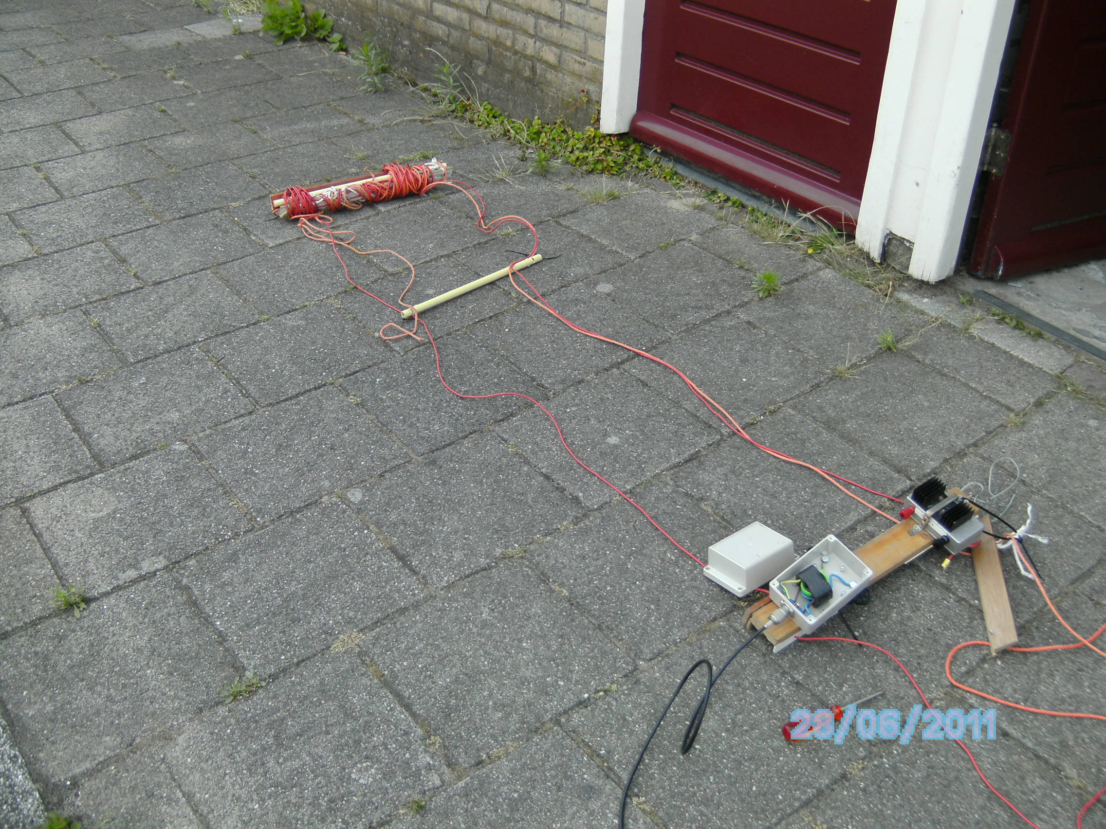 Hij moest licht zijn om doorhangen te voorkomen. 1 helft is ca. 8 meter. Verder een balun en een inductievrije weerstand (daar is moeilijk aan te komen). :?: