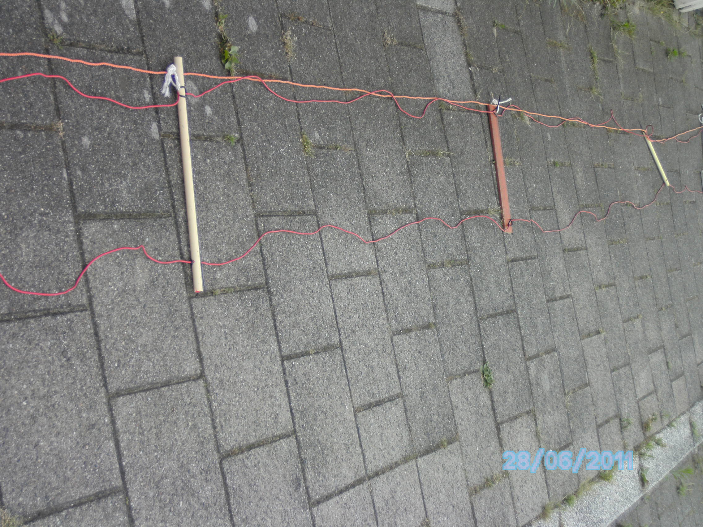 Antenne werkt naar tevredenheid, het ophangen en de constructie wil ik nog wat verbeteren, voor de trekontlasting op de antennedraden zoek ik nog een oplossing, er mag niets van metaal worden gebruikt of een ander geleidend materiaal.