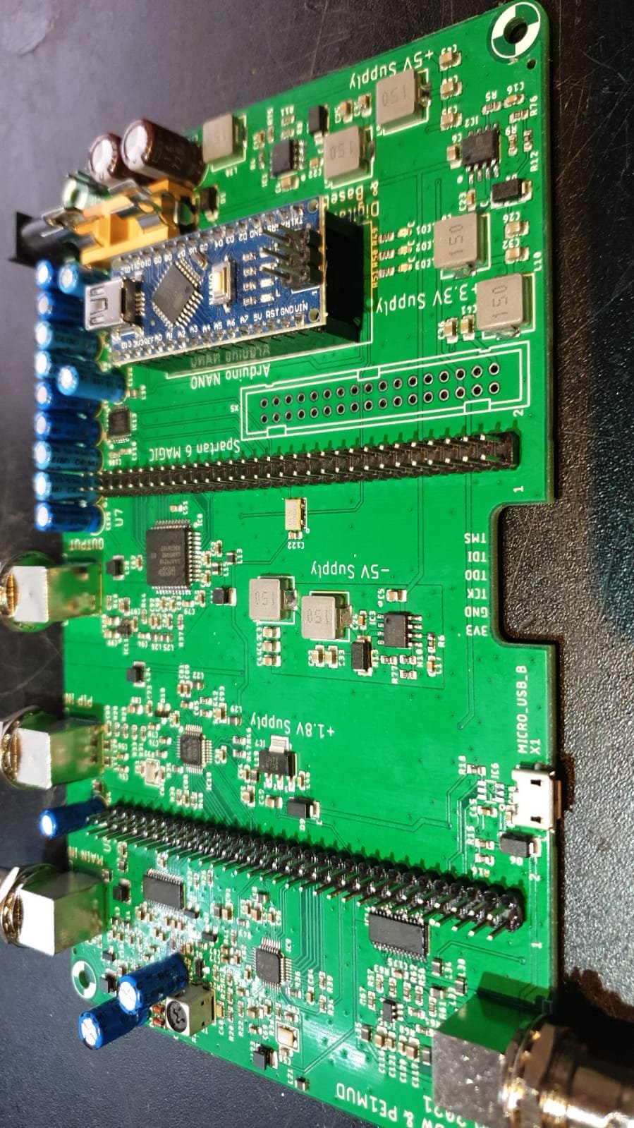 De voeding is +8 tot +15V. Lokaal worden 5V, -5V, 3,3V en 1,2V gemaakt met switchertjes. Geen heet lopende regelaars dus.