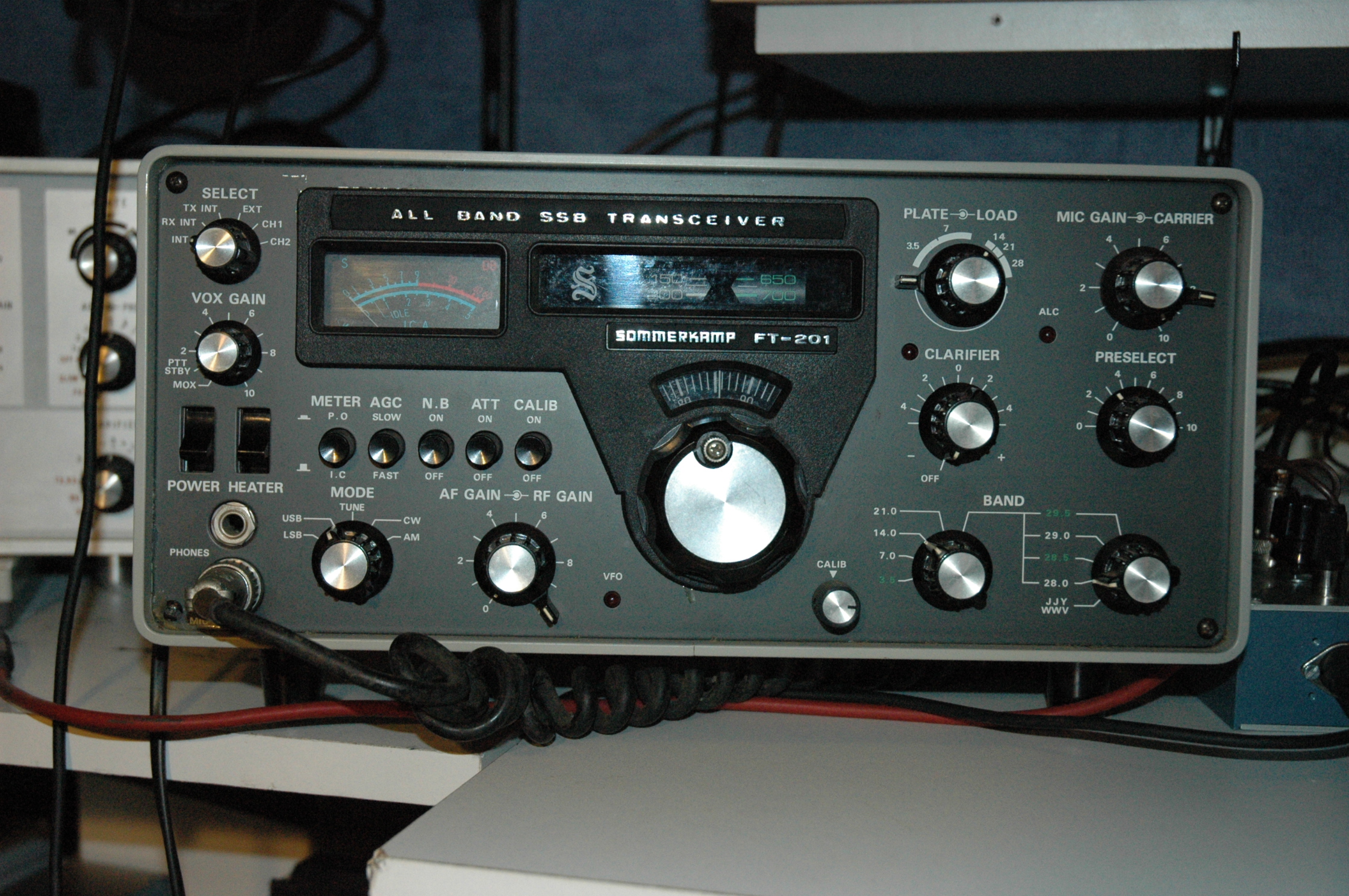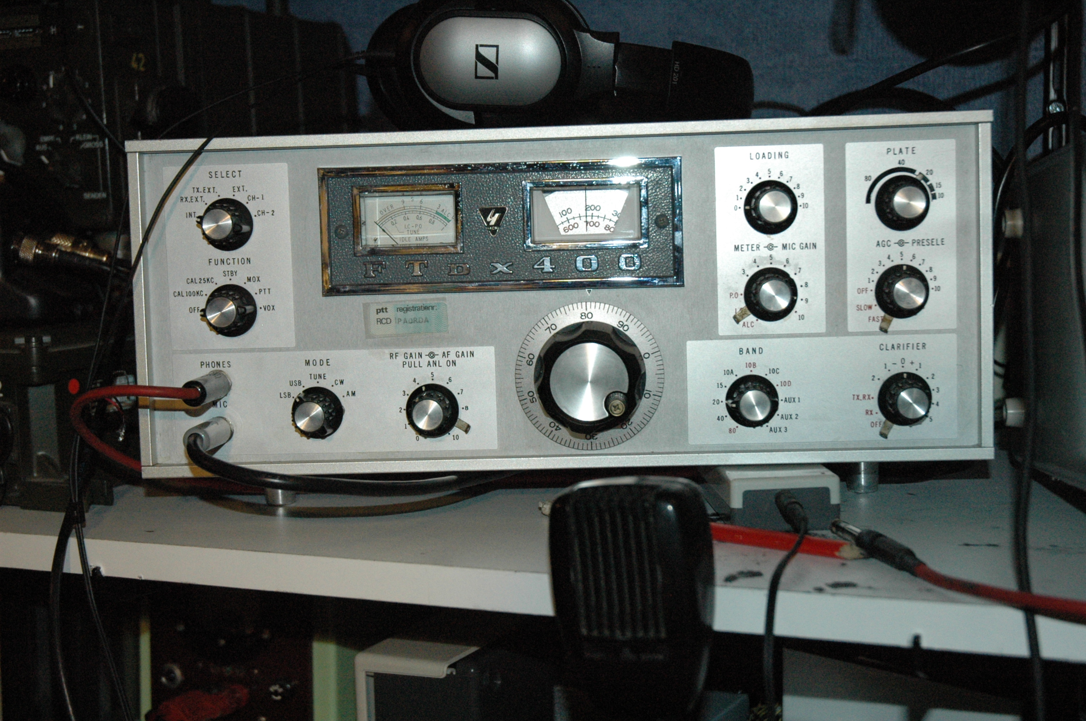 De tweede is een Yaesu FTdx400, dit beest is een tranceiver uit eind jaren 60. Byzonder aan deze is dat hij geen serienummer heeft en niet onder de naam sommerkamp is gelabeld. Hij is toendertijd door een piloot direct bij de fabriek gekocht. In europa werd de naam sommerkamp gebruikt. Dat was de duitse importeur en dat klonk betrouwbaarder dan het japanse yaesu. De jappen hadden toen nog geen beste reputatie. Hij doet zo'n 400W. Vol open geeft de daiwa pepmeter dan 1,2KW PEP aan.